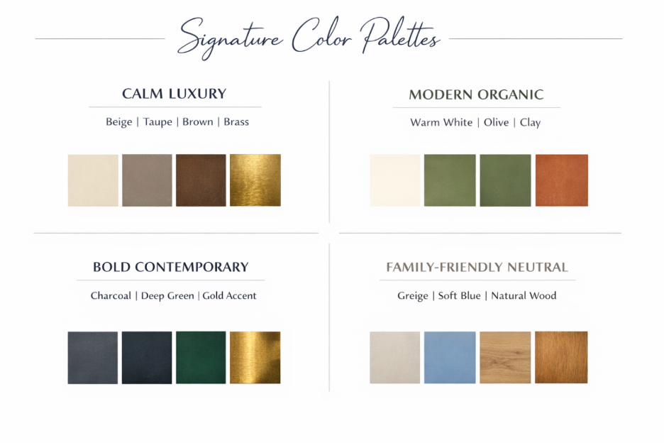Before we explore the palettes below, you might be wondering where to begin—or simply wishing to see a few elegant examples already thoughtfully composed. The following combinations are timeless, balanced, and designed to offer a clear starting point for your home.